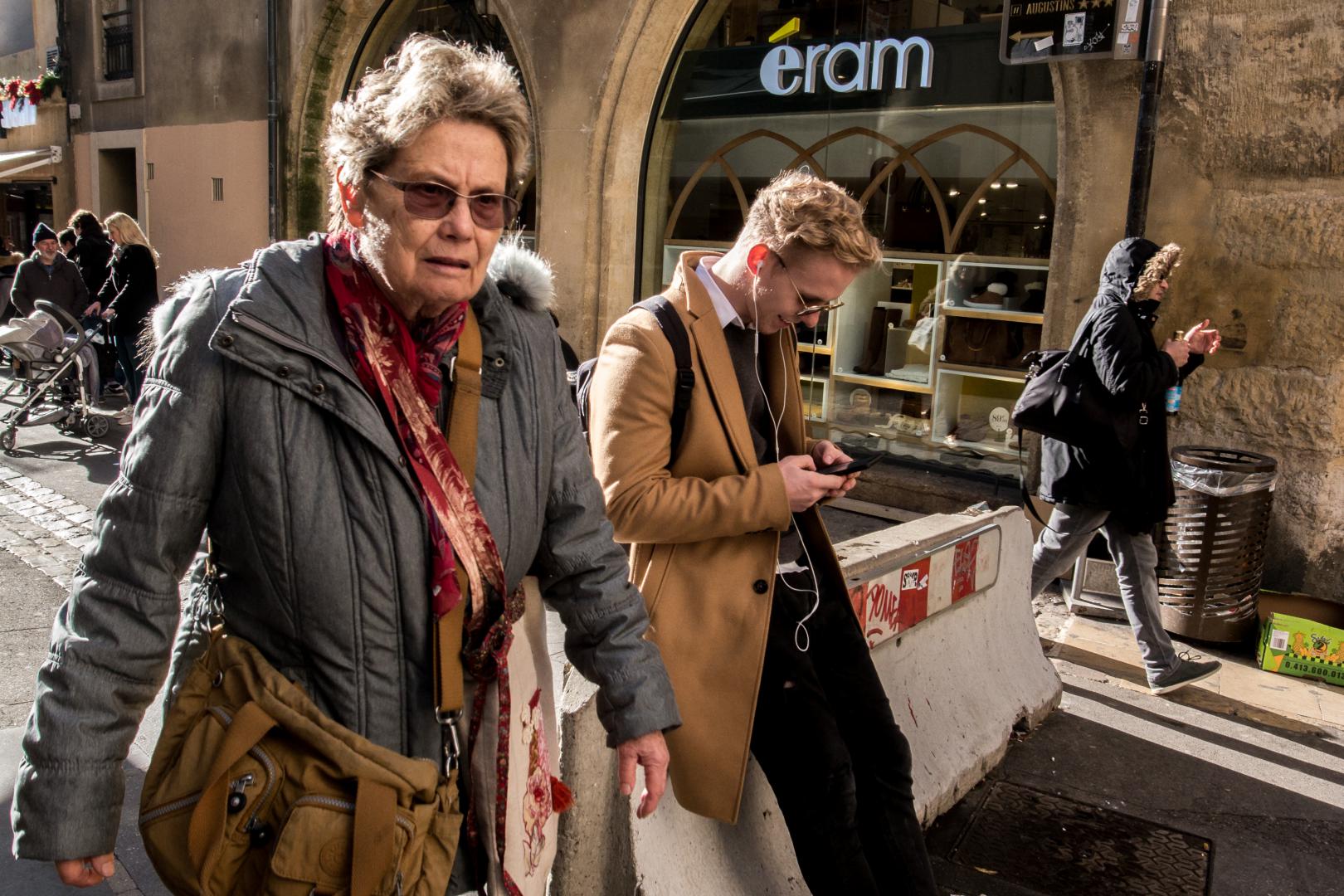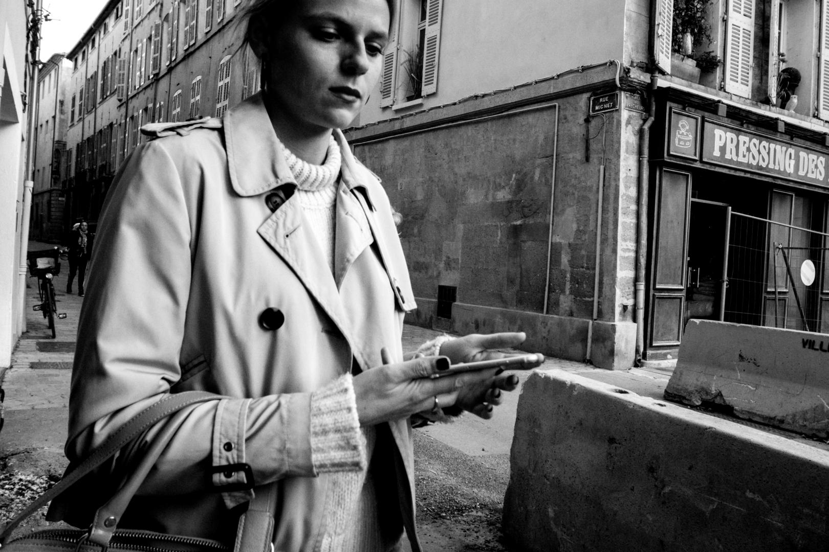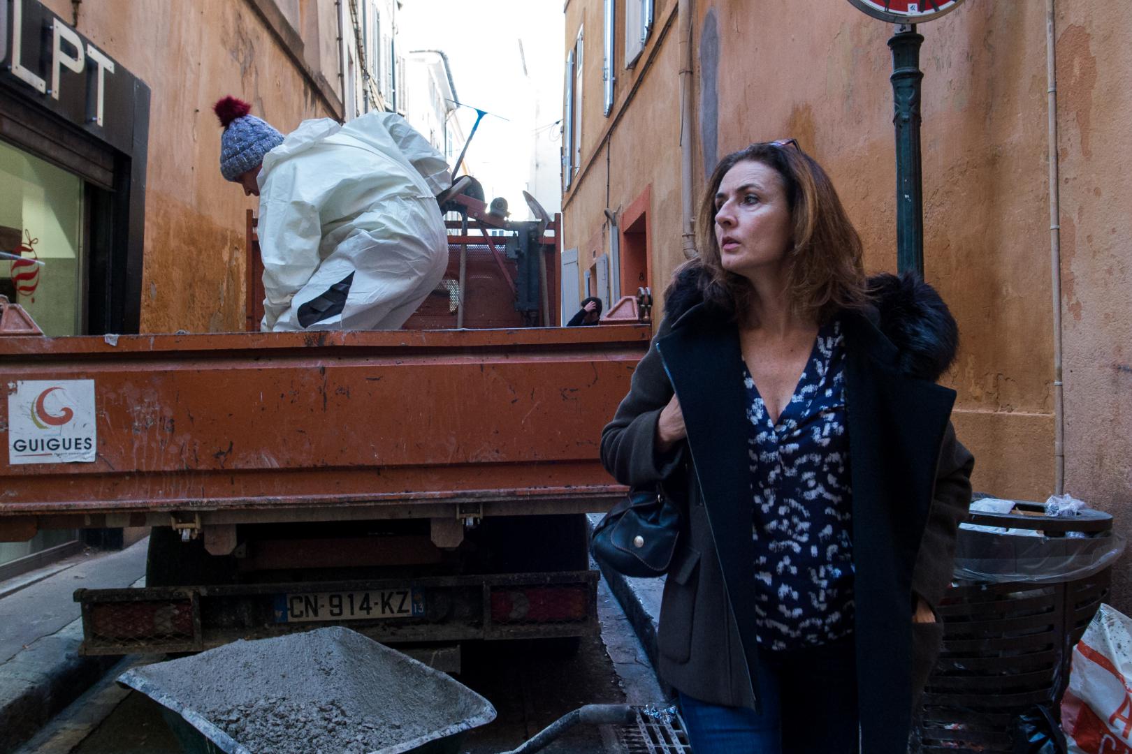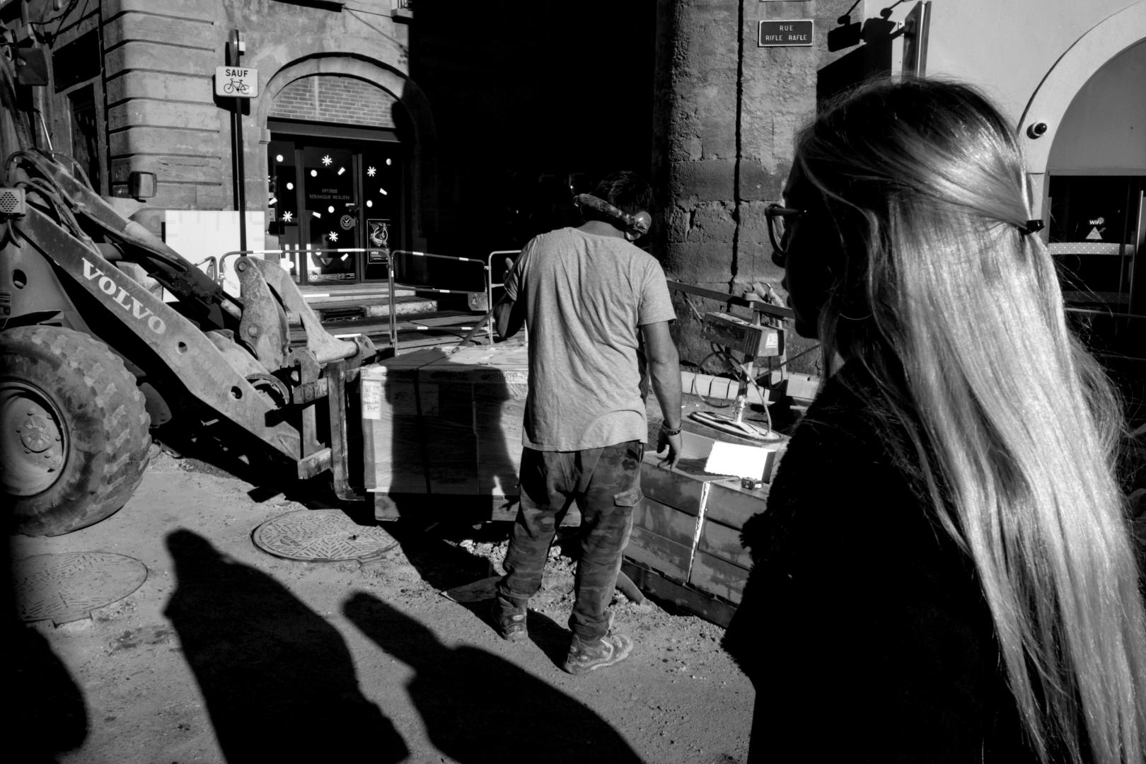 C’est à ce moment que j’ai rencontré une amie que j’ai accompagnée alors qu’elle allait s’acheter des lunettes de vue. C’est l’intérêt de la Street Photography. C’est de l’errance. Il n’y a rien de prémédité. Je l’ai donc accompagnée chez l’opticien où j’ai bien sûr continué à faire des photos. Comme ça s’éternisait je suis sorti faire des photos des travaux qui polluent la ville d’Aix-en-Provence depuis 18 mois. C’est bruyant, avec beaucoup de poussière … Dans 10 ans, les gens ne s’en souviendront plus, mais j’ai amassé beaucoup de photos de cette époque. Je suis resté là un moment, mais j’ai décidé d’aller juste à côté sur la Place du Marché car j’en avais marre du bruit.