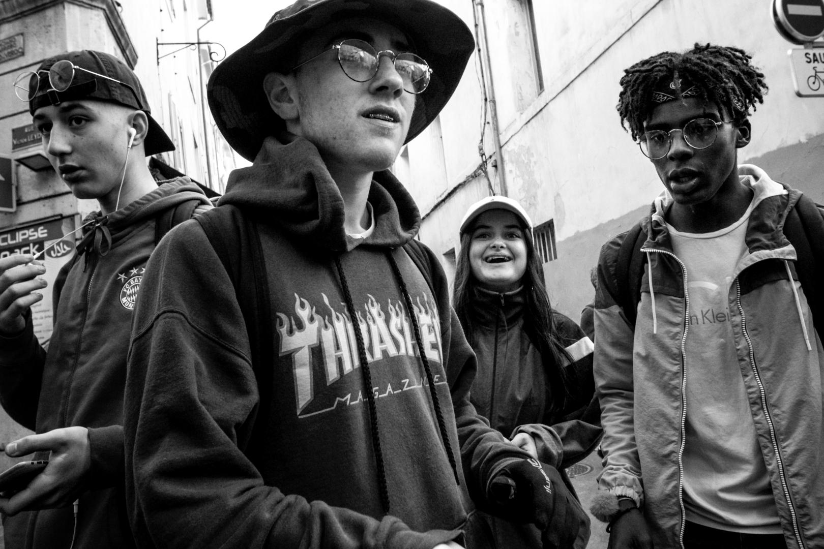 At lunchtime, I also like to hang out on the side of la Rue de la Couronne. This is the favorite spot of students because they come to have lunch in the many restaurants of Kebabs, sandwiches or other fast food. I met at this moment a band of very enthusiastic young people with whom I had a little chat about the excesses on the sidelines of the student demonstrations of the day before. As usual, I continue to take pictures and I am asked if I am a journalist. I answer that I do street photography. I do not know if they understand what it means, but my photos do not bother them anymore. They left as they arrived, all laughing and full of energy, just like the street !