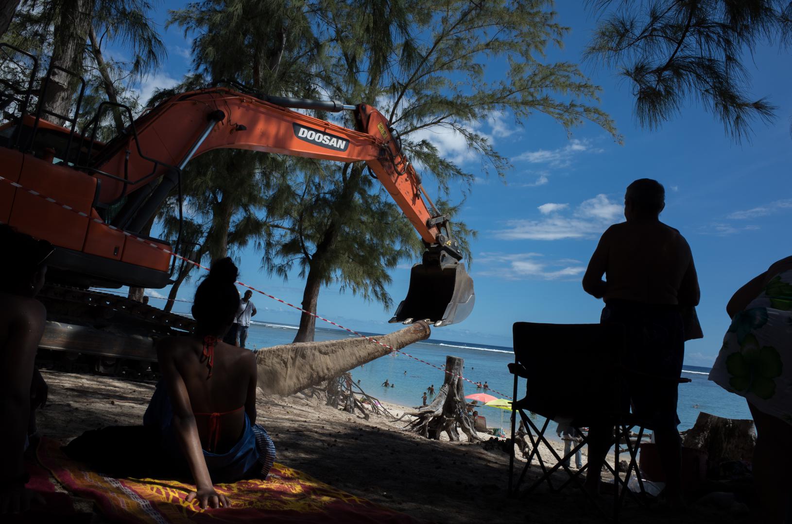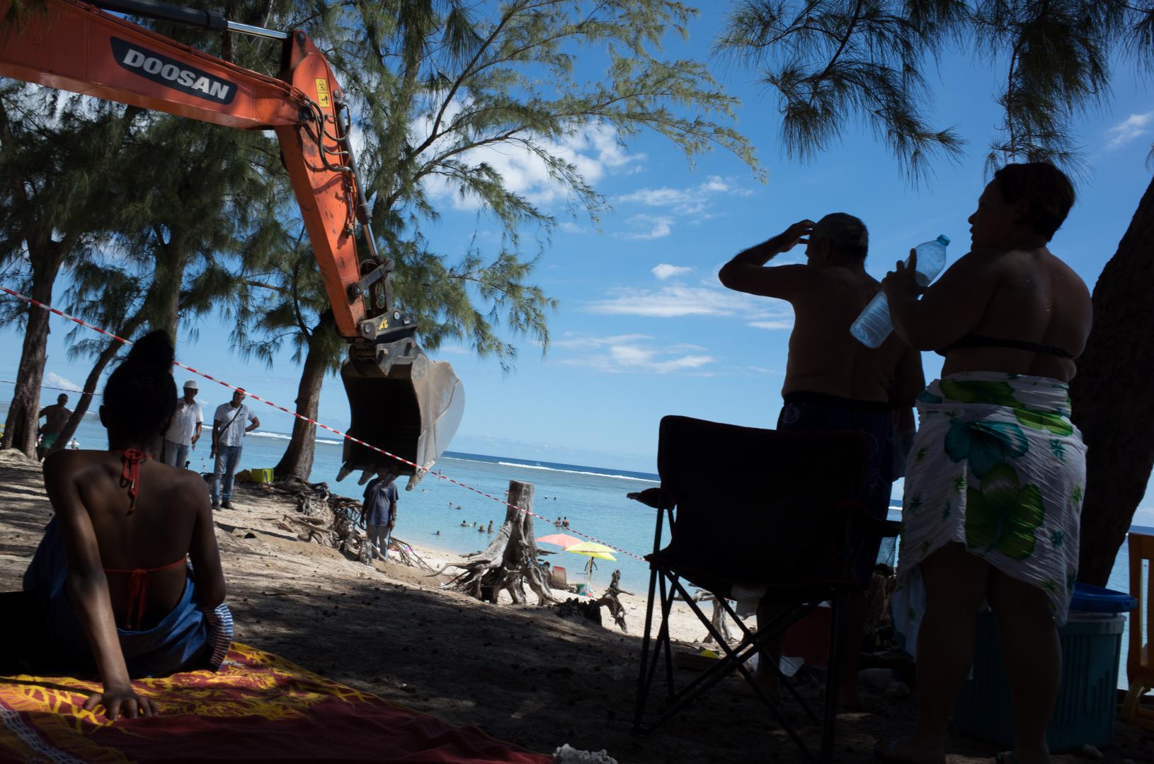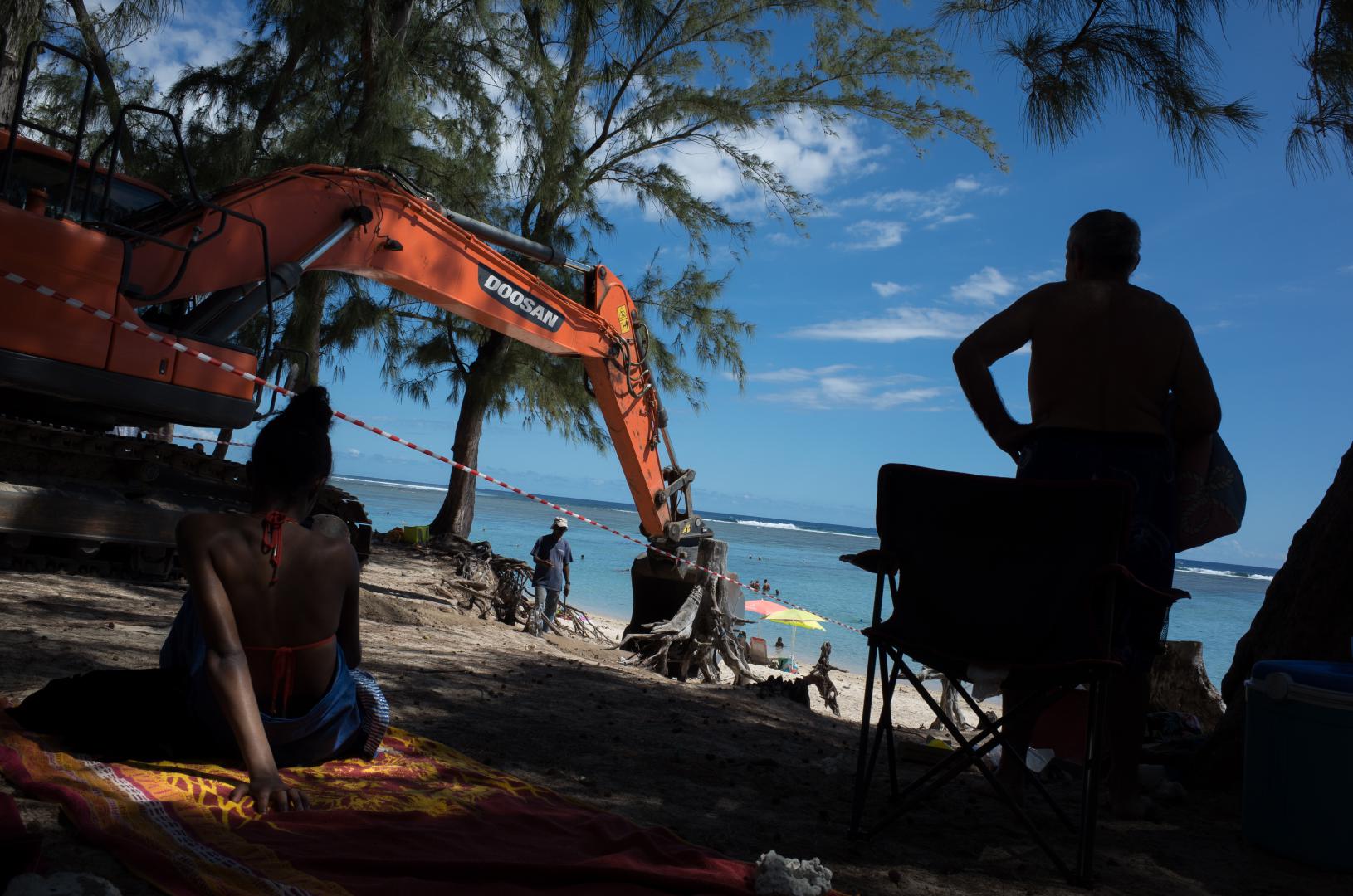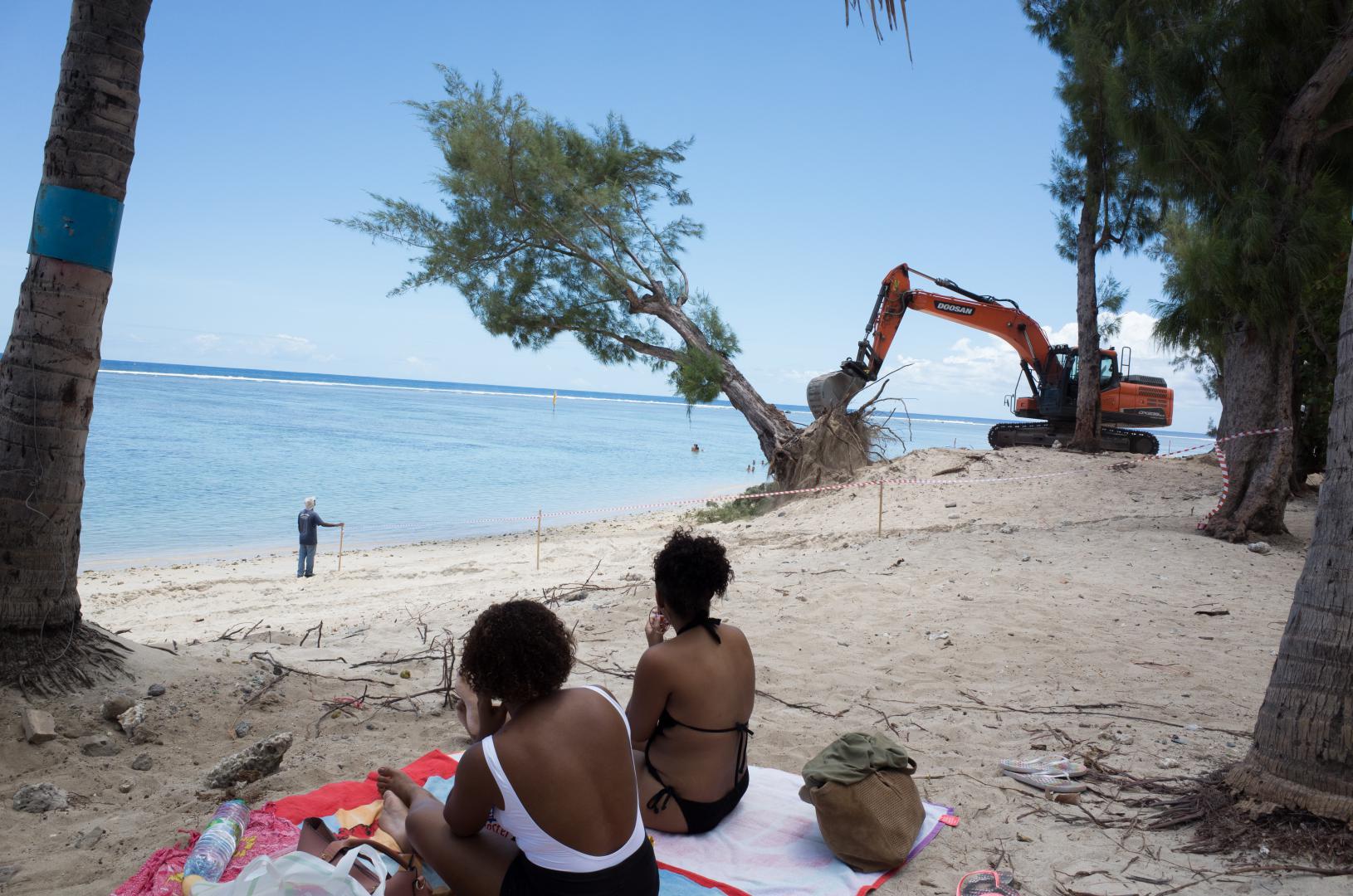 Dans la rue, on est à la recherche de situations assez inhabituelles qui sont des sujets intéressants. Depuis que je suis à la Réunion, on passe beaucoup de temps à la plage avec les enfants et pratiquement toutes mes photos sont ainsi faites en bord de mer. J’ai été attiré par une grosse pelleteuse qui faisait quelques travaux au milieu des personnes allongées à faire bronzette sur le sable. Un périmètre de sécurité était installé pour sécuriser la zone de travail.