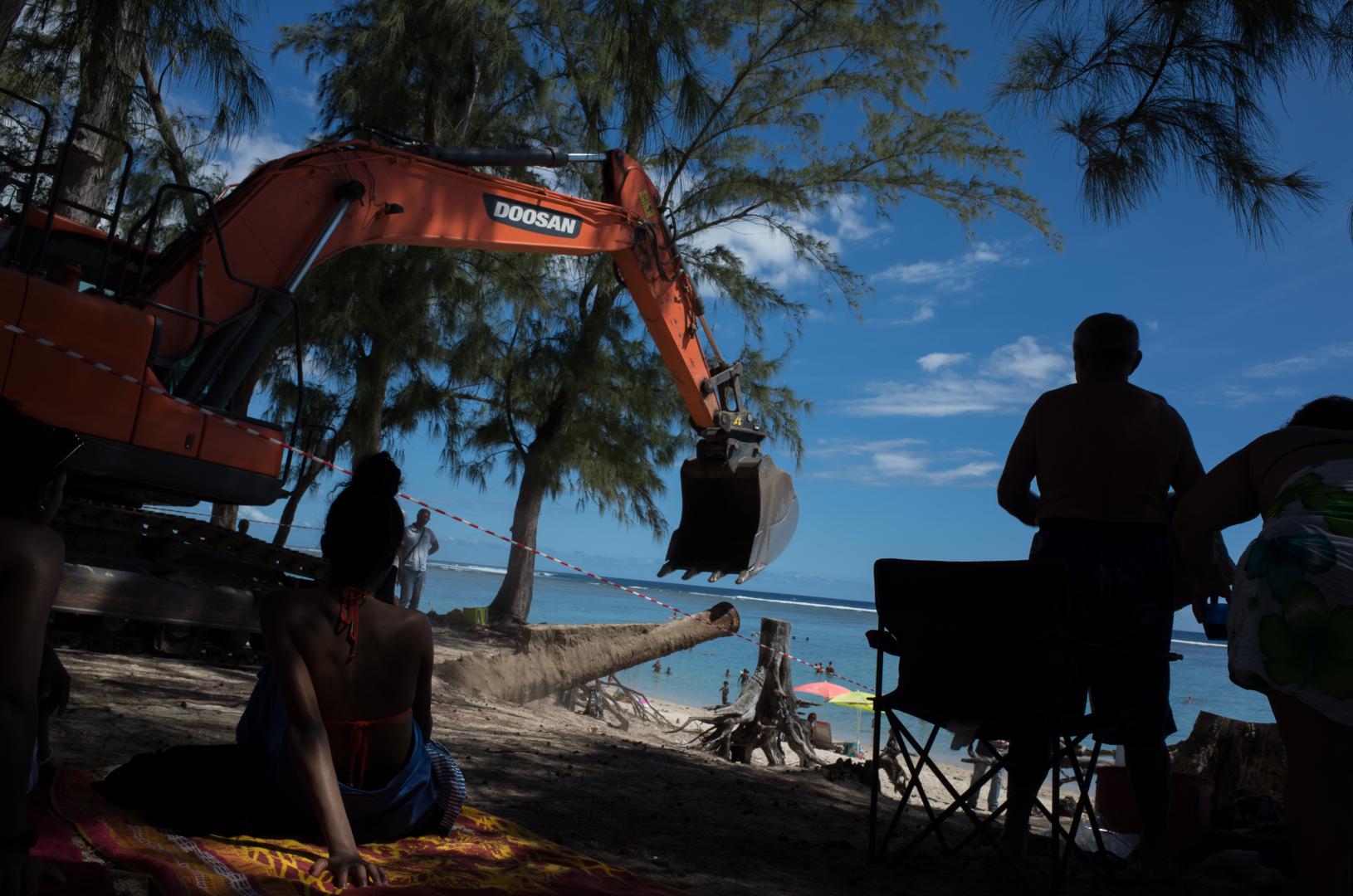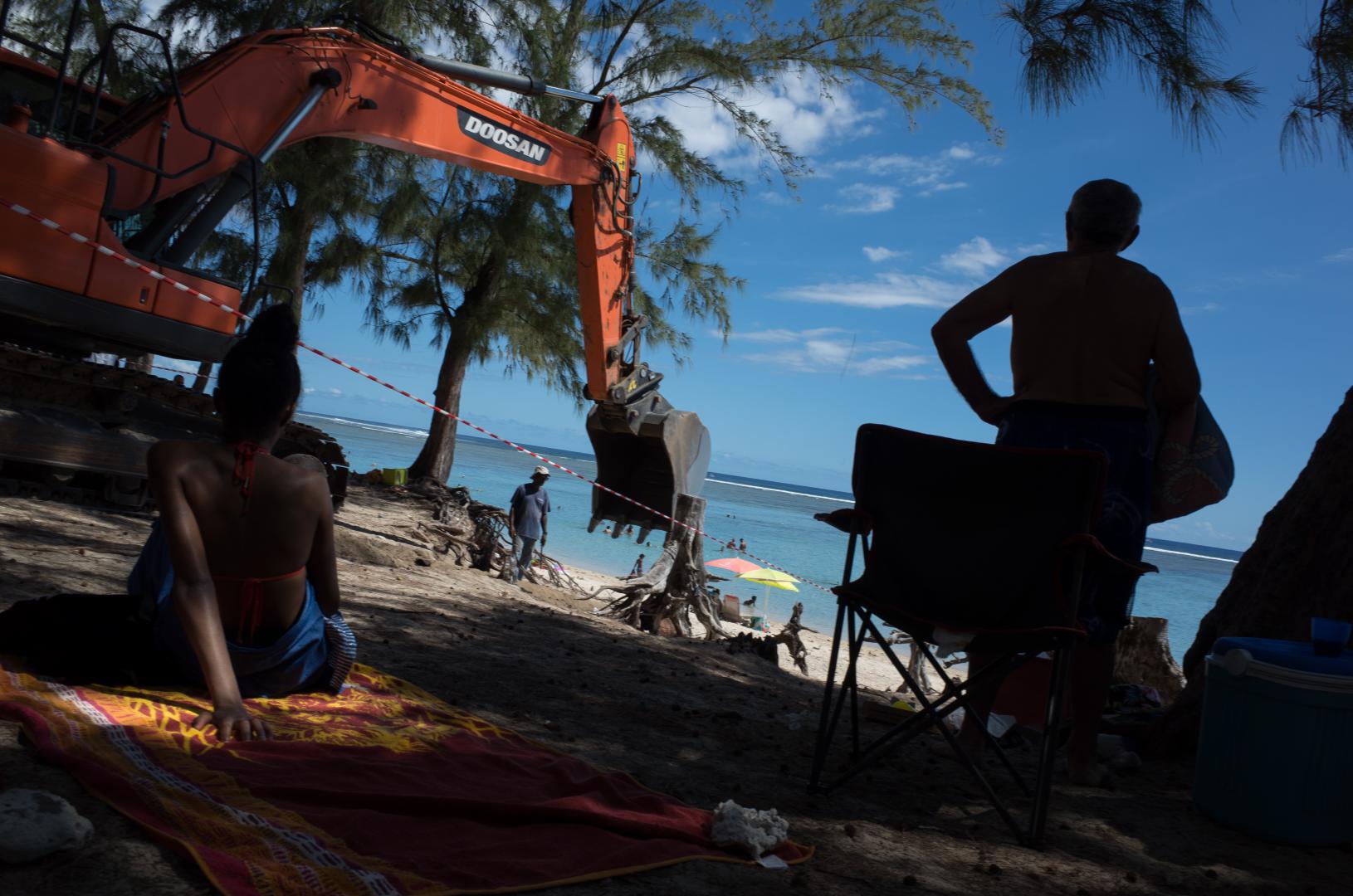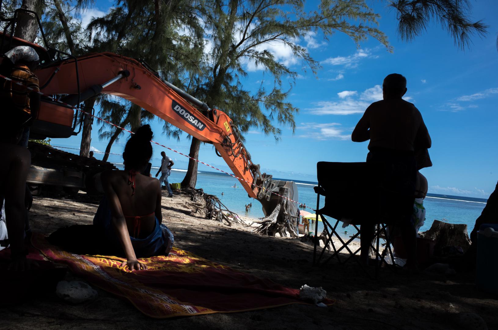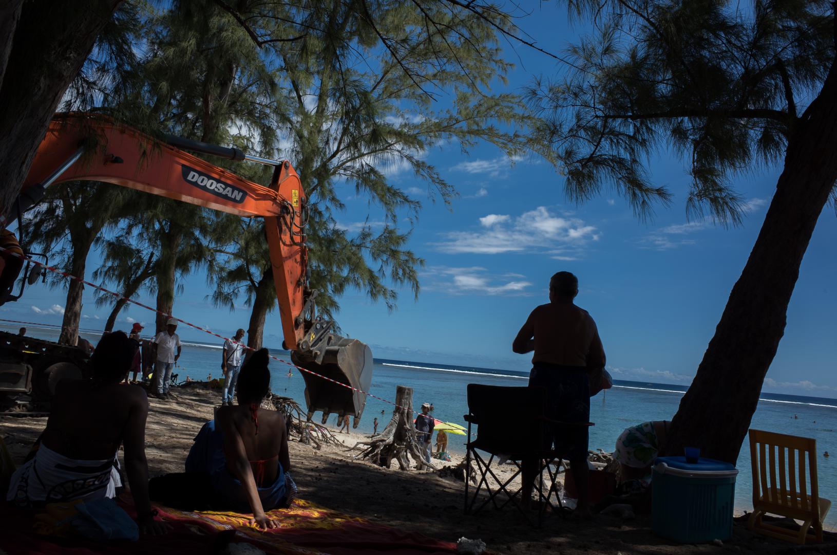 Dans la rue, on est à la recherche de situations assez inhabituelles qui sont des sujets intéressants. Depuis que je suis à la Réunion, on passe beaucoup de temps à la plage avec les enfants et pratiquement toutes mes photos sont ainsi faites en bord de mer. J’ai été attiré par une grosse pelleteuse qui faisait quelques travaux au milieu des personnes allongées à faire bronzette sur le sable. Un périmètre de sécurité était installé pour sécuriser la zone de travail.