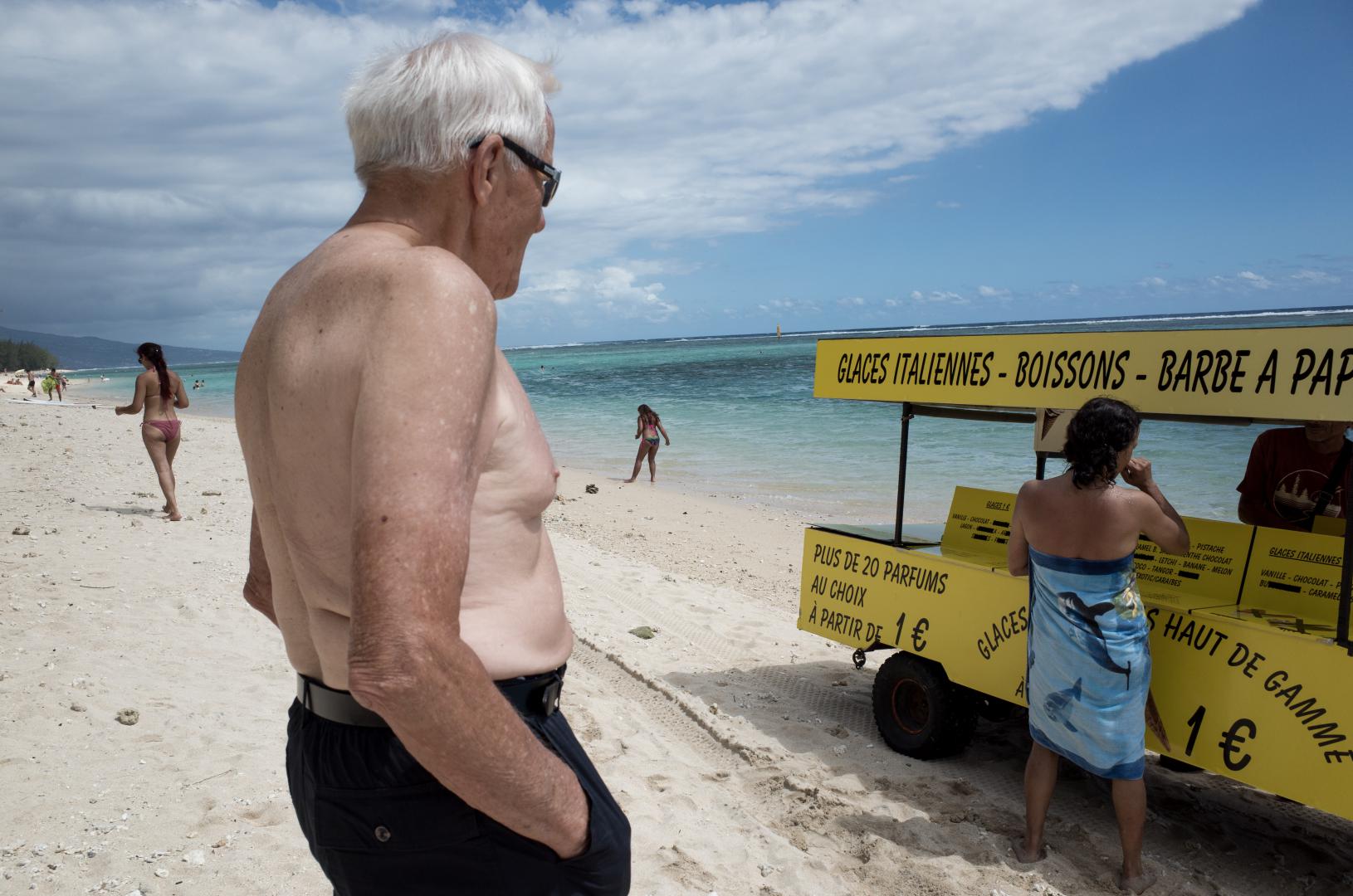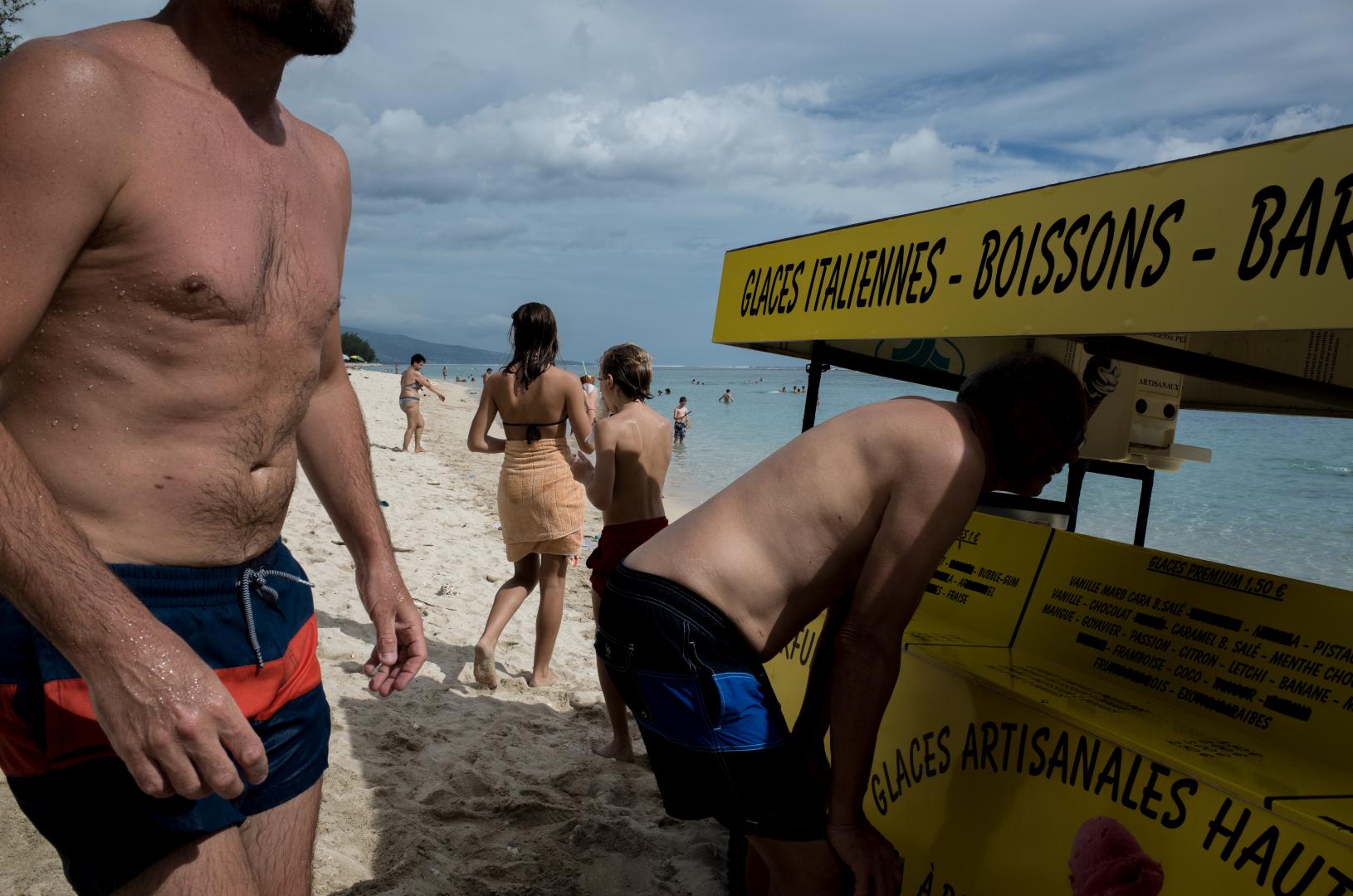 J’étais surtout à la plage pour profiter de la mer avec ma famille. Comme d’habitude, entre deux baignades pour aller voir les poissons multicolores, j’ai le Ricoh au poignet pour faire des photos de mes enfants. Vous vous doutez bien que la tentation est trop grande pour aller faire un peu de Beach Street. Pas besoin d’aller bien loin, il se passe mille choses à la plage. Un peu comme dans la ville, mais j’ai l’impression qu’à la plage, les photos viennent à vous. Un peu comme le marchand de glaces ! Ce gars avec son échoppe à roues jaune, je l’ai repéré dès le premier jour, tellement je l’ai trouvé photogénique. Et ce qu’il y a de bien avec ce genre de petits commerces ambulants, c’est qu’il y a toujours du monde qui fait la queue en attendant d’être servis. Je n’ai plus qu’à me mettre dans la queue et de faire des photos en attendant mon tour ! En plus à la fin j’ai une glace !