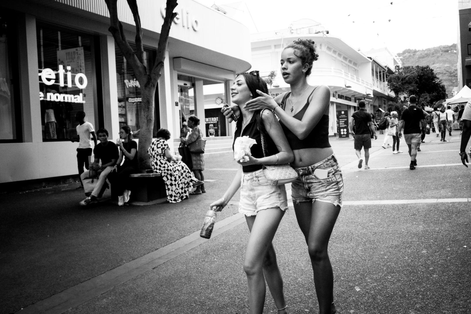 Some might dismiss this photo as just another picture of two pretty girls walking down the street, and therefore dismiss me as a photographer who is simply attracted to the physical beauty of these young women. I won’t lie to you, and it’s true that my eye was drawn to their youth and beauty. But I’ll tell you why I found this photo very interesting. Here, I also photographed youth as I see it every day on the streets of Saint-Denis. I haven’t forgotten that I’m documenting the streets of my city, and the photo shows several elements of this era.