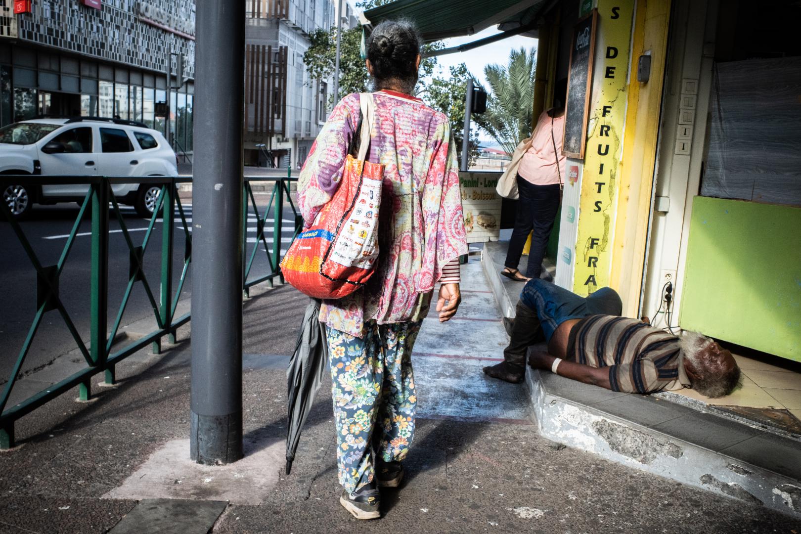 On the street, there is always this desire not to photograph people in situations that do not show them in a favourable light, but also not to censor the street by not photographing what is dirty or ugly. I have decided to photograph everything. This man lying on the ground is unfortunately a familiar figure to the people of Saint-Denis. When he is more or less sober, he begs for money, and when he is completely drunk, he is always lying down somewhere. He lives on the street, goes to the city’s emergency room when he is not feeling well, and shortly afterwards, he is back on the streets. I regularly give him a few coins when I am hanging out in Saint-Denis. I know very well what that money will be used for, but I give it to him anyway… When you spend a lot of time on the streets, you see new people arriving on the pavements and you even witness their descent into hell. I’ve seen the evolution of other homeless people. Those who still took care of themselves a little, who tried to maintain some dignity, only to see them several months later as rags dragging themselves around the city. It breaks my heart. I had talked to one of them. I was surprised to realise that this man who had just arrived on the street was someone like you and me. Out of modesty, I didn’t ask him why he was now on the street. We just talked and I gave him some coins. What struck me was that he had beautiful long white hair that contrasted with his tanned skin. That same homeless man has been on the streets of Saint-Denis for several years now. He has now a empty stare, his hair is cut very short, and he has long since lost the well-groomed appearance he had when he first arrived on the street. I have even seen people disappear completely from the landscape. There was a woman whose decline I witnessed over several months. Then one day, poof, she was gone. We don’t tell ourselves that this person has gone somewhere else. We know very well that after a while, this person has probably passed away.