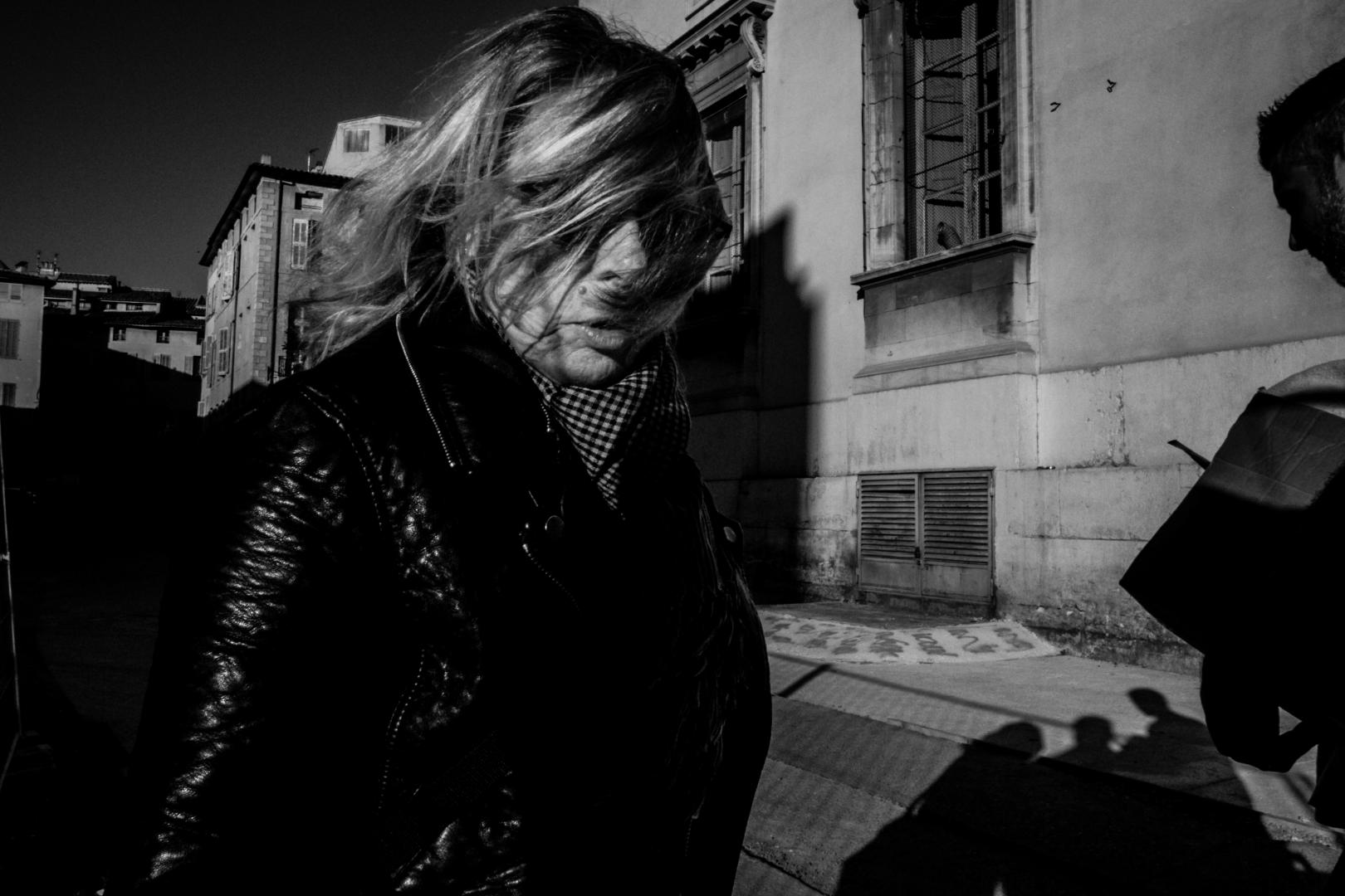 Cette photo a été réalisée avce le Ricoh GRD 4. La mise au point n’est pas parfaite, mais elle dégage quelque chose qui me plait. Je marchais au milieu de la rue quand j’ai vu cette femme sortir d’un immeuble et venir dans ma direction avec sa cigarette qui pendouillait. Je n’ai rien fait pour lui laisser le passage. Je pense qu’on s’est légèrement frôlé. Dans pratiquement tout le centre ville d’Aix-en-Provence, les ruelles sont étroites et me permettaient d’être près des gens pour faire des close-up. D’ailleurs je pense que ça a influencé mon style photographique dans un premier temps. J’ai beaucoup fait et je continue de faire beaucoup de photos de ce style. Depuis quelques temps je m’en éloigne un peu, préférant des scènes d’ensemble. Il y a beaucoup d’énergie qui se dégage de cette photo. Il n’y a que le GRD 4 qui offre un rendu pareil. C’est organique.