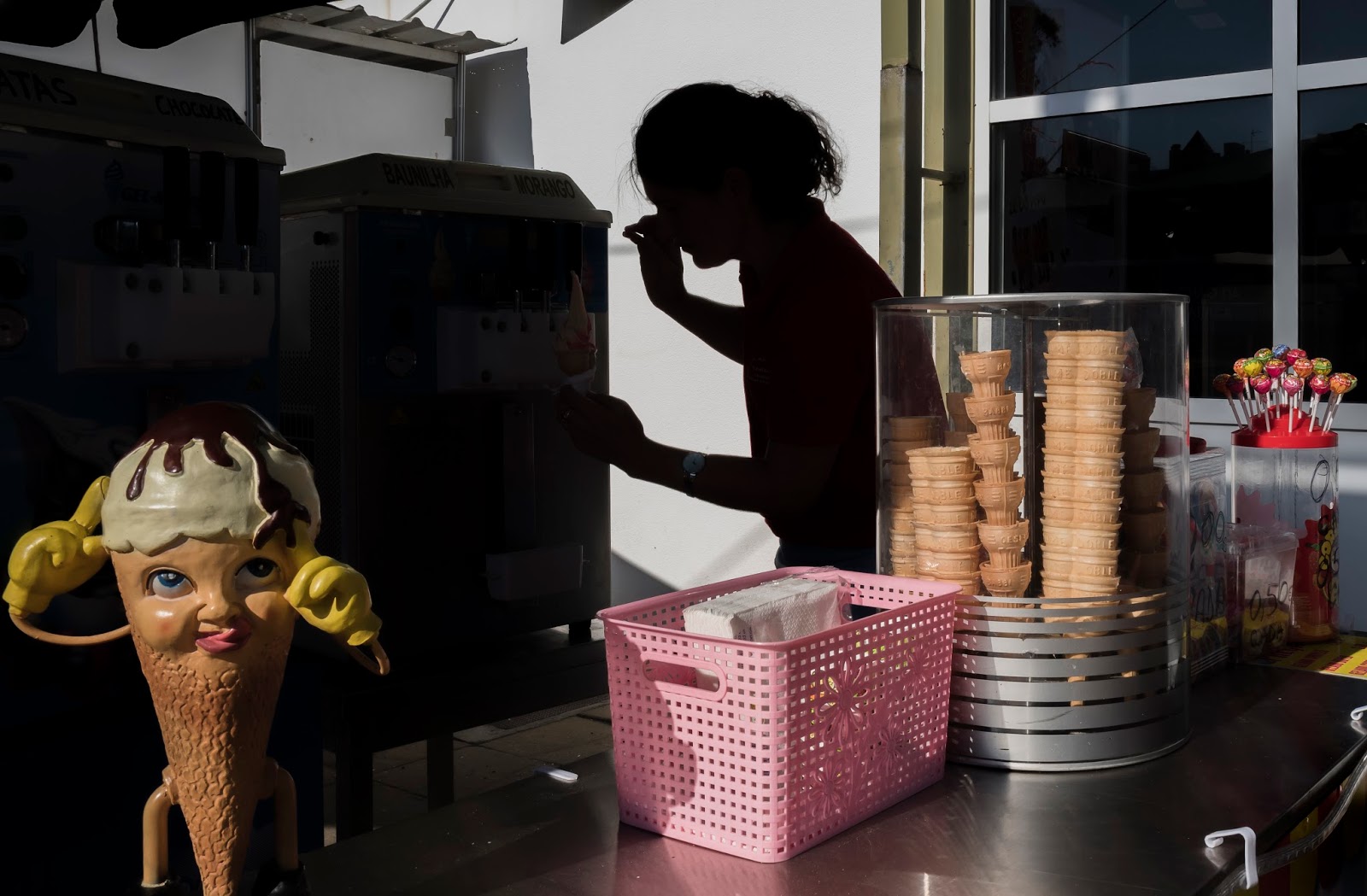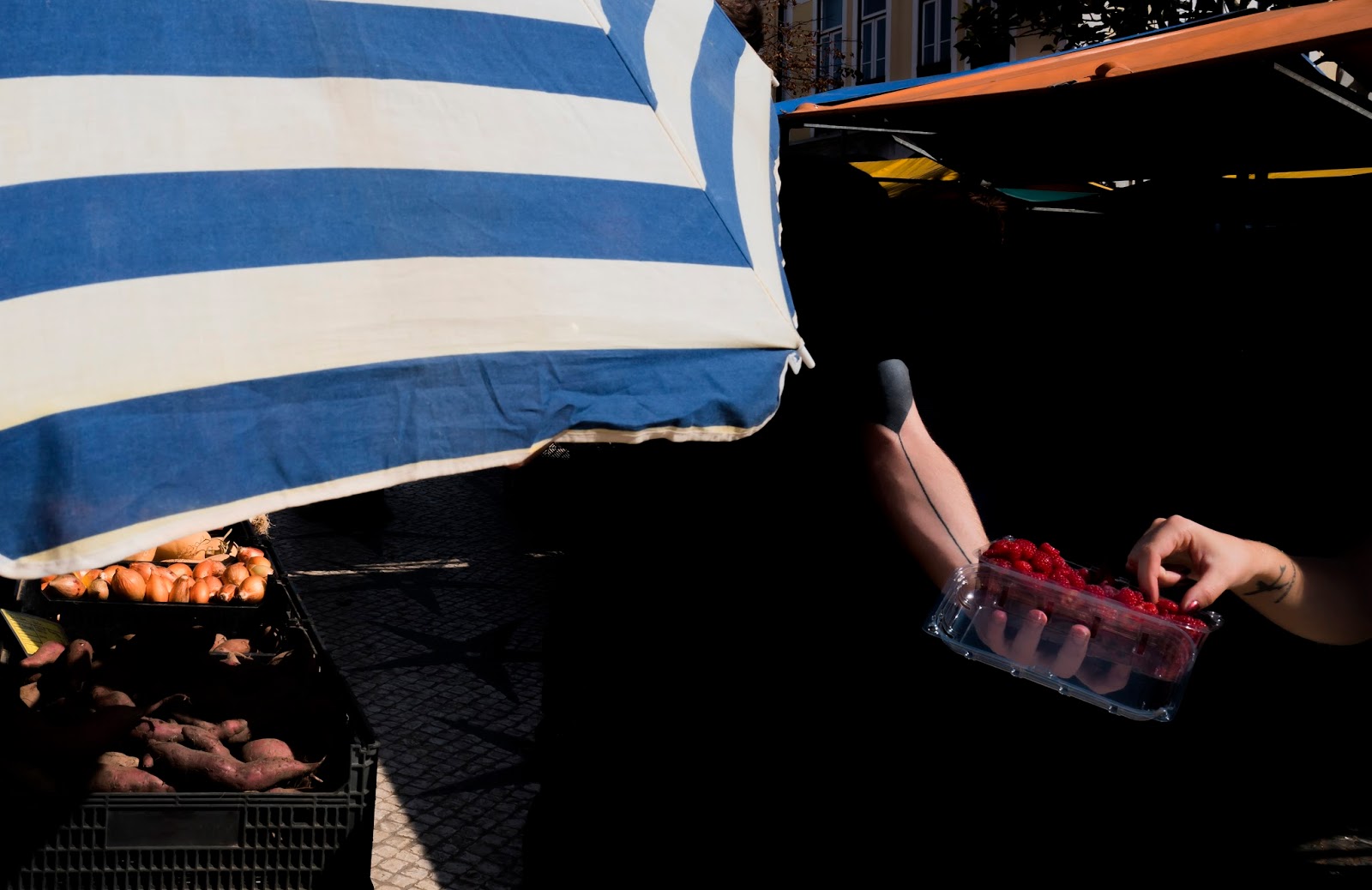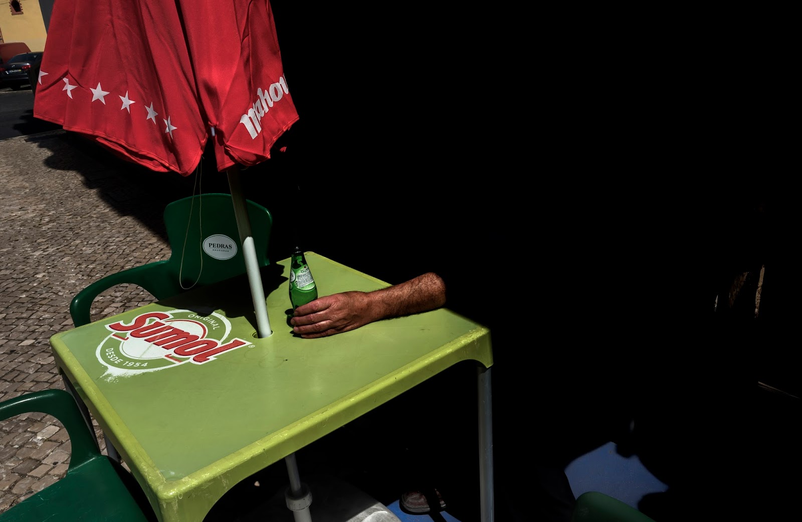 Sur ce dernier exemple, nous avons des fragments humains qui émergent de l’ombre. Nous avons des éléments récurrents. Des mains, des parasols. Ces deux photos sont toutes les deux énigmatiques dans leur conception. Vasco ne montre pas tout et laisse beaucoup de place à l’interprétation.