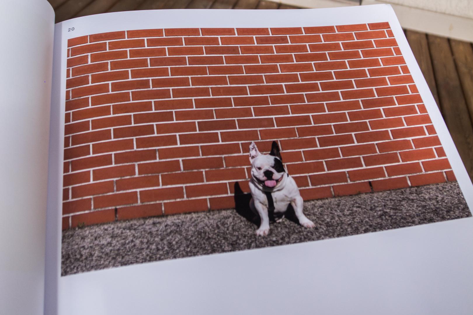 Parfois il faut savoir casser le rythme et ne pas mettre les planches côte à côte, même si au final il y a un élément commun aux deux photos, à savoir le chien. Ces deux photos sont seules sur la page de droite alors qu’elles pourraient cohabiter sur une même double page. Je pense que ce choix délibéré, donne plus d’importance à chacune des photos individuellement , mais oblige le lecteur à revenir aussi sur la page précédente pour se rendre compte que même si ces photos ne sont pas sur la même double page, elles communiquent néanmoins entre elles.