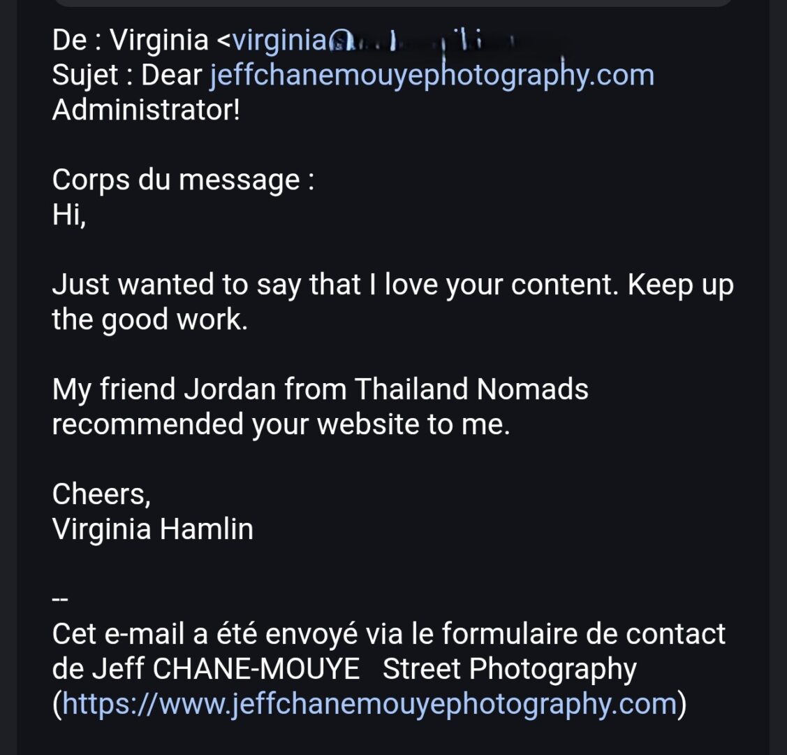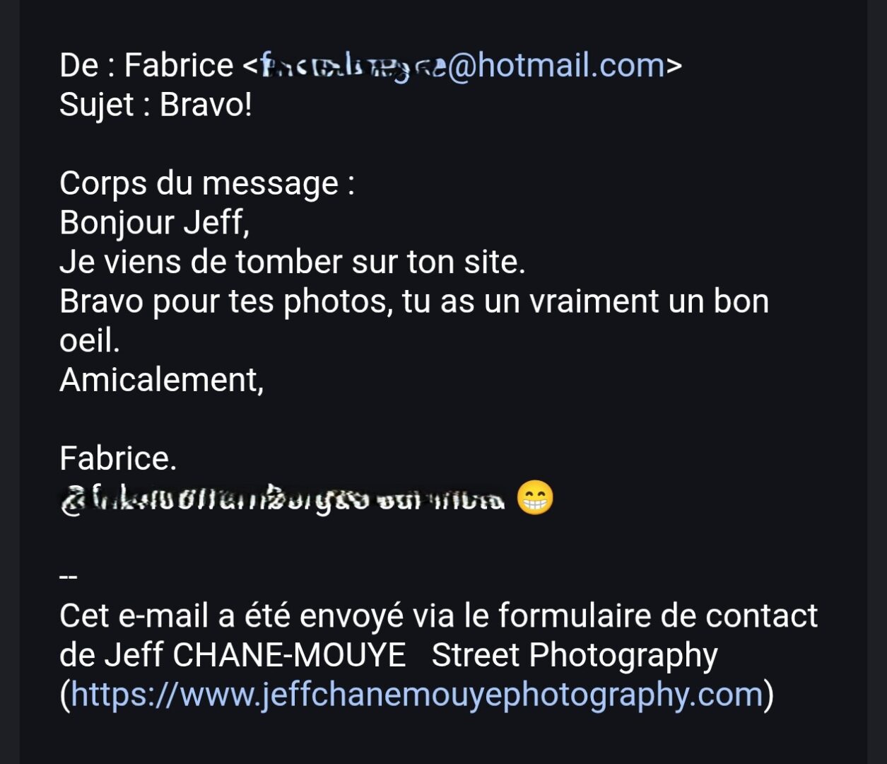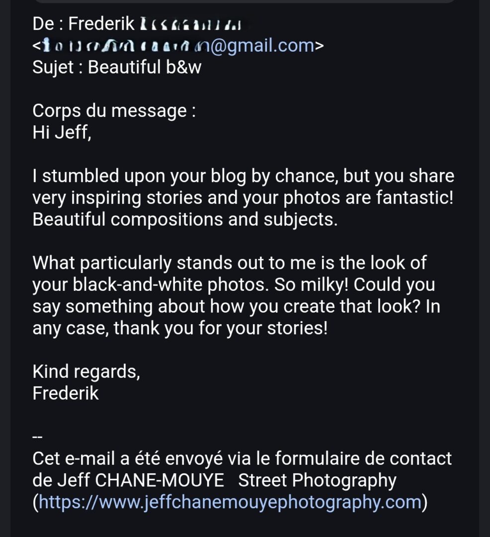 Depuis les nombreuses années que je tiens ce Blog, j’avais de temps en temps des photographes qui m’écrivaient pour échanger ou juste dire une petite bafouille à propos de mon site. Ces derniers mois, alors que je suis de moins en moins assidu à l’écriture d’articles, je suis surpris de voir des photographes prendre contact avec moi pour me pour me parler de mon Blog qu’ils ont récemment découvert et du plaisir qu’ils ont eu en le parcourant. Je vous mets ci-dessous, les mails reçus.